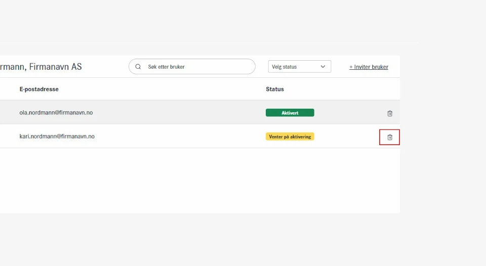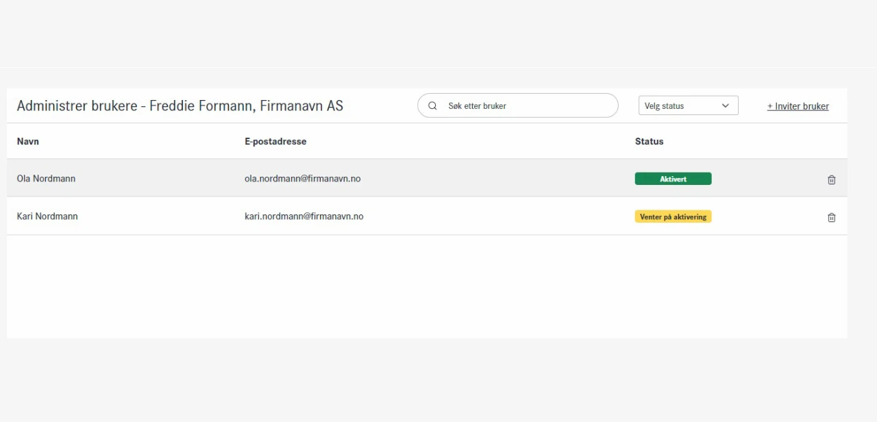På dashboardet for brukeradministrasjon har du full oversikt og kontroll over brukere. Du har mulighet til å enkelt se hvilke brukere som er lagt til, navn, e-postadresse og status. Du kan også filtrere brukere på status, dersom du har lagt til mange. "Aktive" brukere har allerede har fullført aktiveringsprosessen og har tilgang til netthandel, mens "venter på aktivering" er brukere som ennå ikke har fullført registreringen.