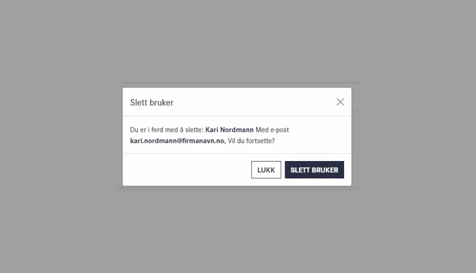 Du har også mulighet til å slette brukere som ikke lenger skal ha tilgang til netthandelen. Trykk på søplebøtten til høyre for brukeren du vil slette. Bekreft at du ønsker å slette brukeren ved å trykke "slett bruker". Slik sikrer du at du alltid har full kontroll og oversikt over hvem som kan handle på vegne av bedriften din.