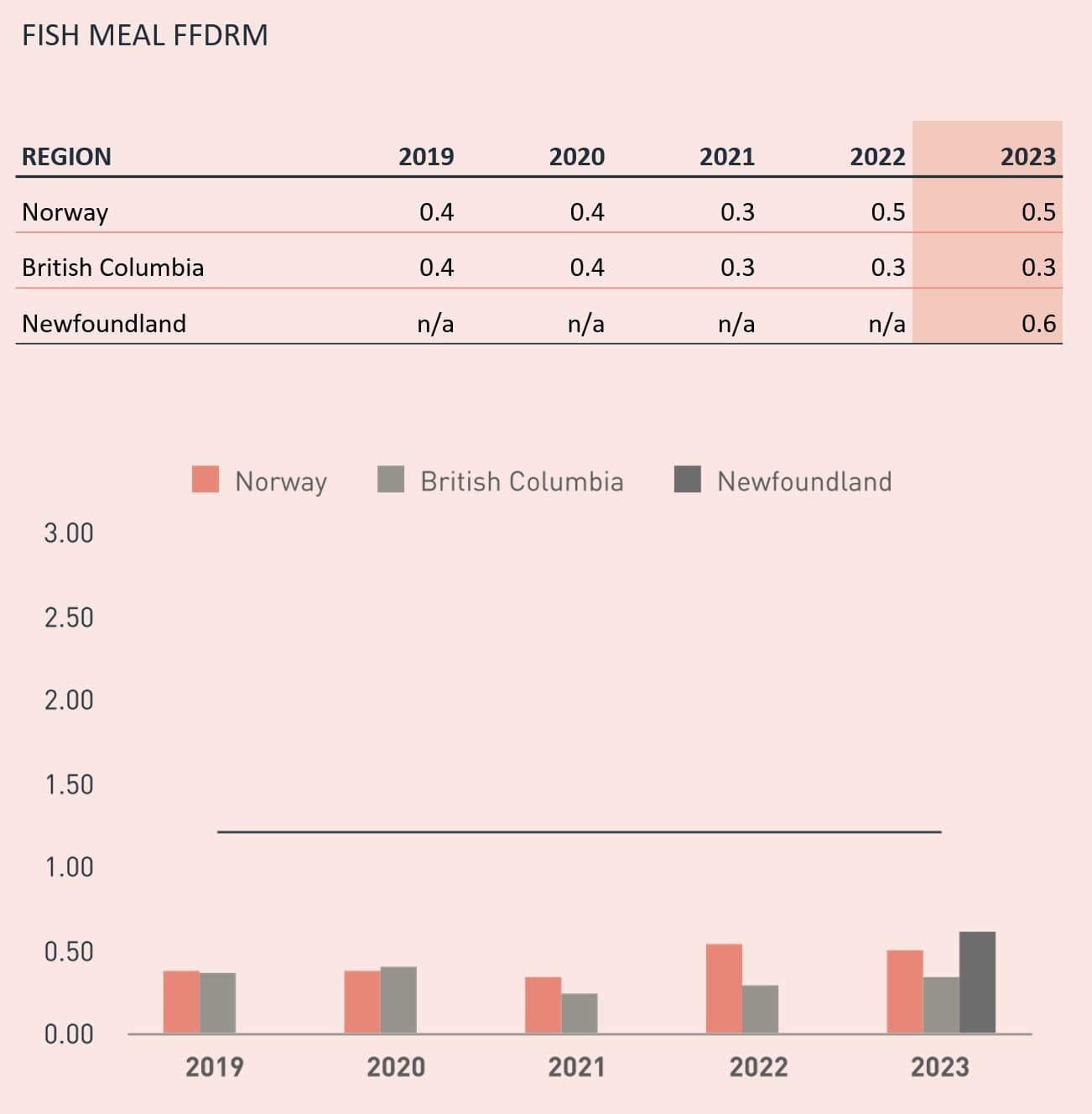 FISH MEAL FFDRM: The forage fish dependency ratio (FFDR) represents the amount of wild fish needed to produce sufficient fishmeal for one kilo farmed salmon. Our FFDRm figures show that we were a net producer of marine protein in 2023 in all regions. The ASC standard has set the limit for responsible sourcing.