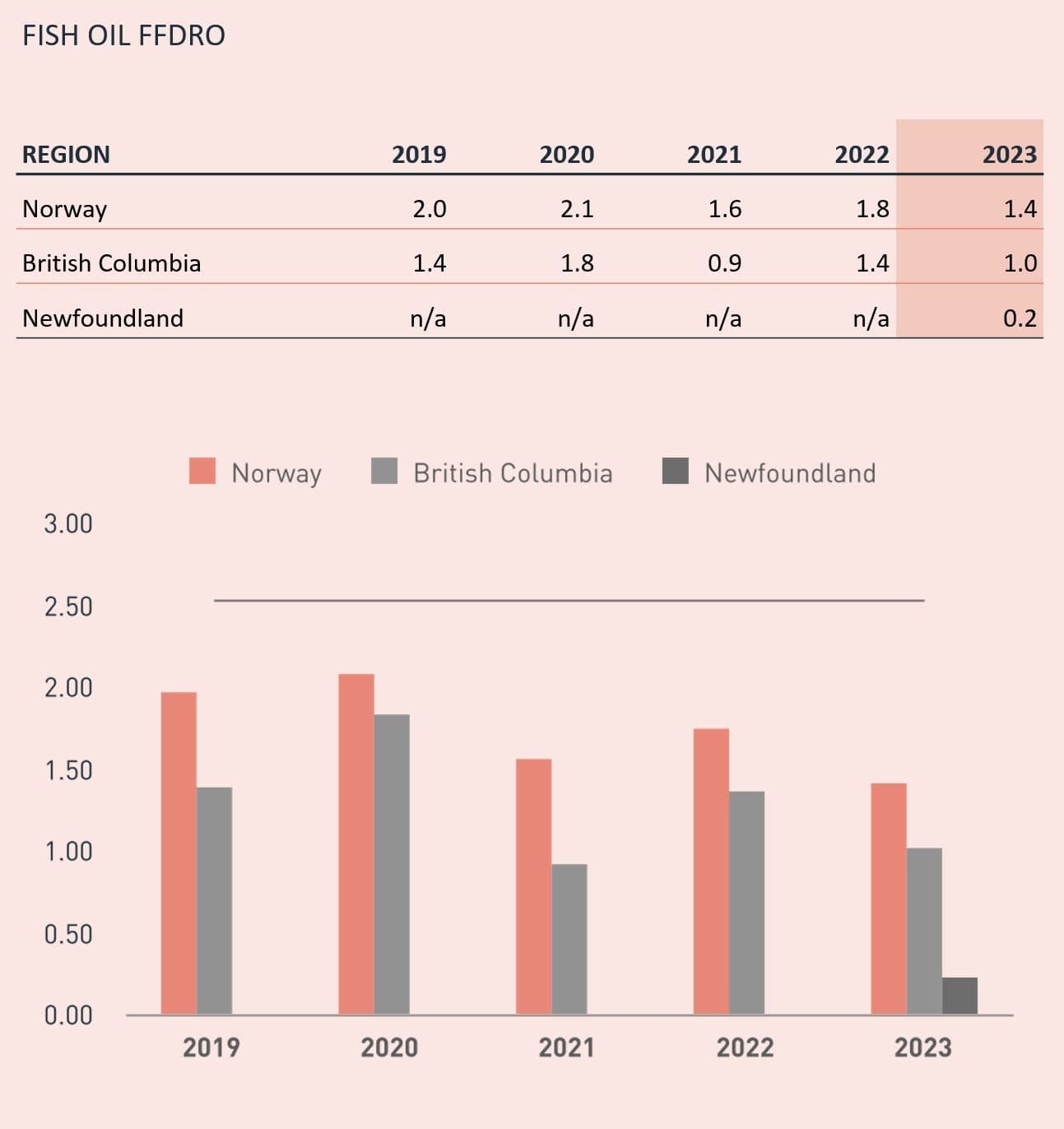 FISH OIL FFDRO: The forage fish dependency ratio (FFDR) represents the amount of wild fish needed to produce sufficient fish oil for one kilo farmed salmon. The ASC standard has set limits for responsible sourcing.