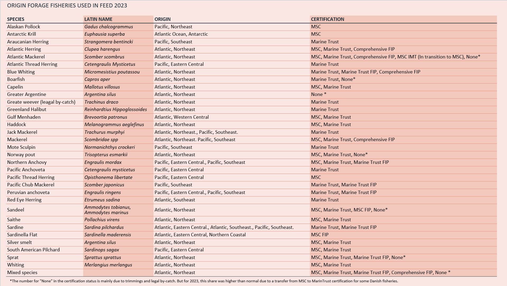 The table below shows species, origin and certification of forage fisheries used in our feed during 2023. For information on marine fish stock status including the stock status assessment, please refer to www.fishsource.org.